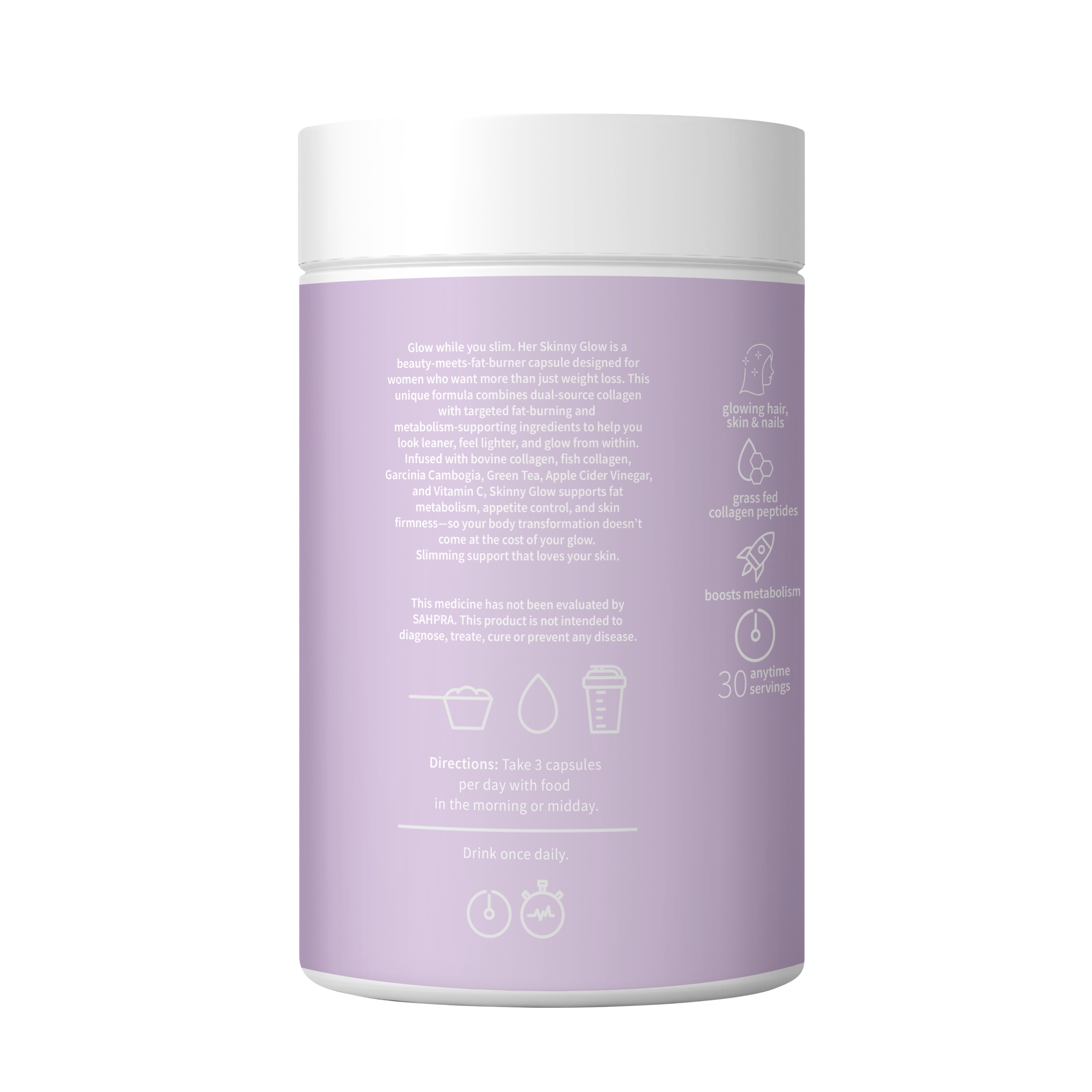 Glow while you slim. Her Skinny Glow is a beauty-meets-fat-burner capsule designed for women who want more than just weight loss. This unique formula combines dual-source collagen with targeted fat-burning and metabolism-supporting ingredients to help you look leaner, feel lighter, and glow from within. Infused with bovine collagen, fish collagen, Garcinia Cambogia, Green Tea, Apple Cider Vinegar, and Vitamin C, Skinny Glow supports fat metabolism, appetite control, and skin firmness—so your body transformation doesn’t come at the cost of your glow. Slimming support that loves your skin.