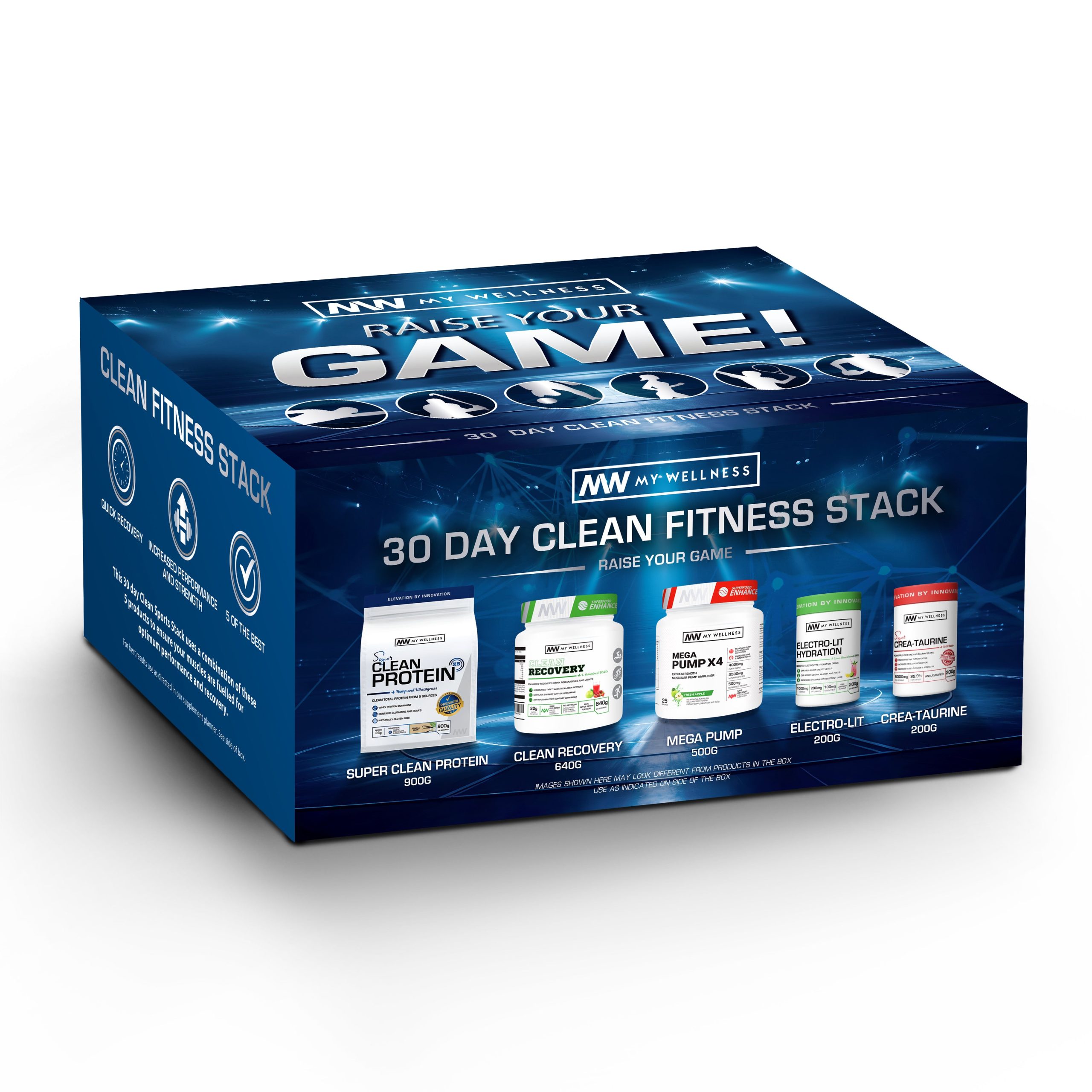 The My Wellness 30 Day Fitness Stack is designed to fuel your body for peak performance and support optimal recovery. This powerful combination of five products includes Super Clean Protein 900g Vanilla for muscle building, Clean Recovery 640g Apple Berry for post-workout repair, Mega Pump 500g Apple for enhanced energy and endurance, Electro-Lit Hydration 200g to keep you hydrated, and Crea-Taurine 200g for improved strength and muscle function. Together, these high-quality supplements ensure that your body has everything it needs to perform at its best and recover faster, helping you reach your fitness goals in just 30 days.