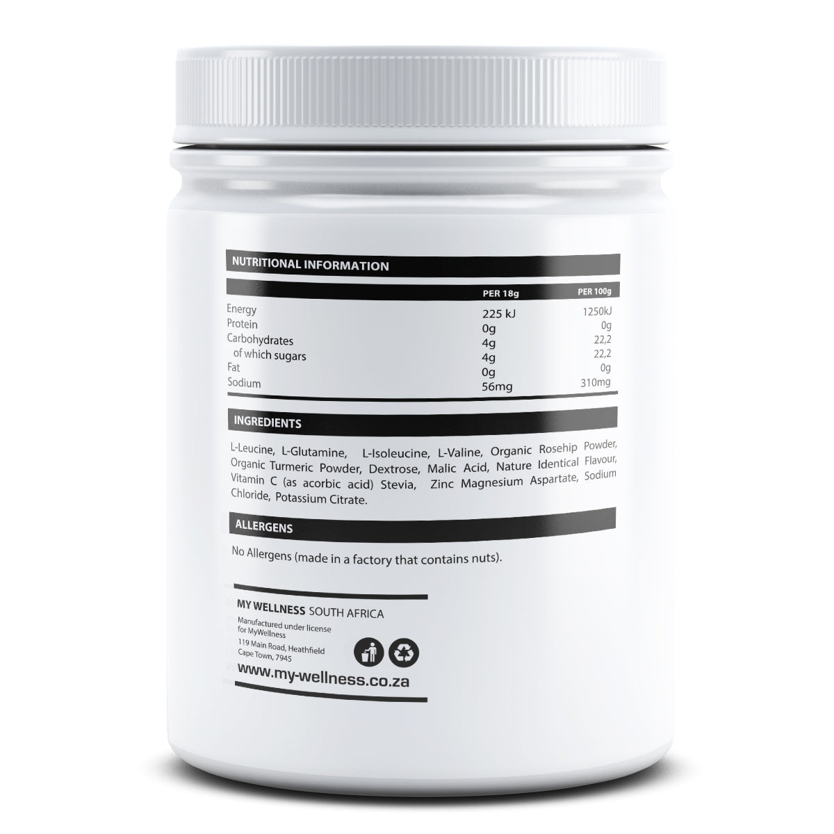 L-Leucine, L-Glutamine, L-lsoleucine, L-Valine, Organic Rosehip Powder, Organic Turmeric Powder, Dextrose, Malic Acid, Nature Identical Flavour, Vitamin C (as acerbic acid) Stevia, Zinc Magnesium Aspartate, Sodium Chloride, Potassium Citrate.