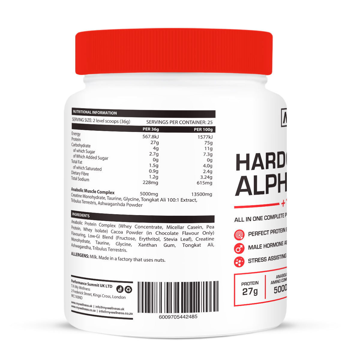 Creatine Monohydrate, Taurine, Glycine, Tongkat Ali 100:1 Extract, Tribulus Terrestris, Ashwagandha PowderINGREDIENTSAnabolic Protein Complex (Whey Concentrate, Micellar Casein, Pea Protein, Whey Isolate) Cacoa Powder (in Chocolate Flavour Only) Flavouring. Low GI Blend (Fructose, Erythritol, Stevia Leaf), Creatine Monohydrate, Taurine, Glycine, Xanthan Gum, Tongkat Ali, Ashwagandha, Tribulus Terrestris.ALERGENS: MiIk. Made in a factory that uses nuts.