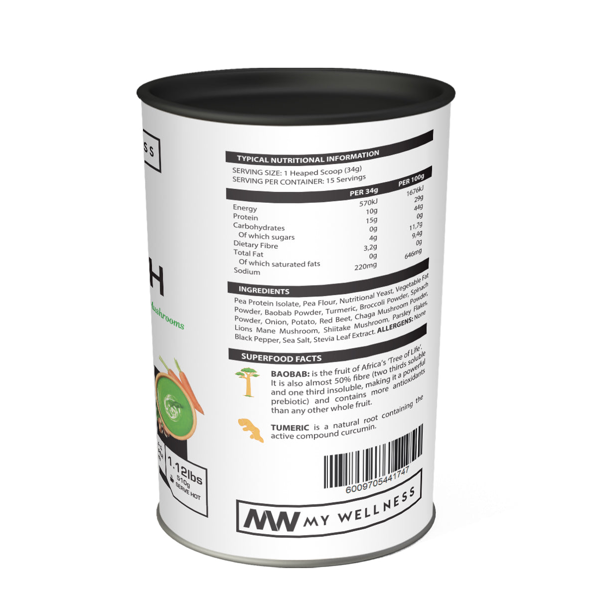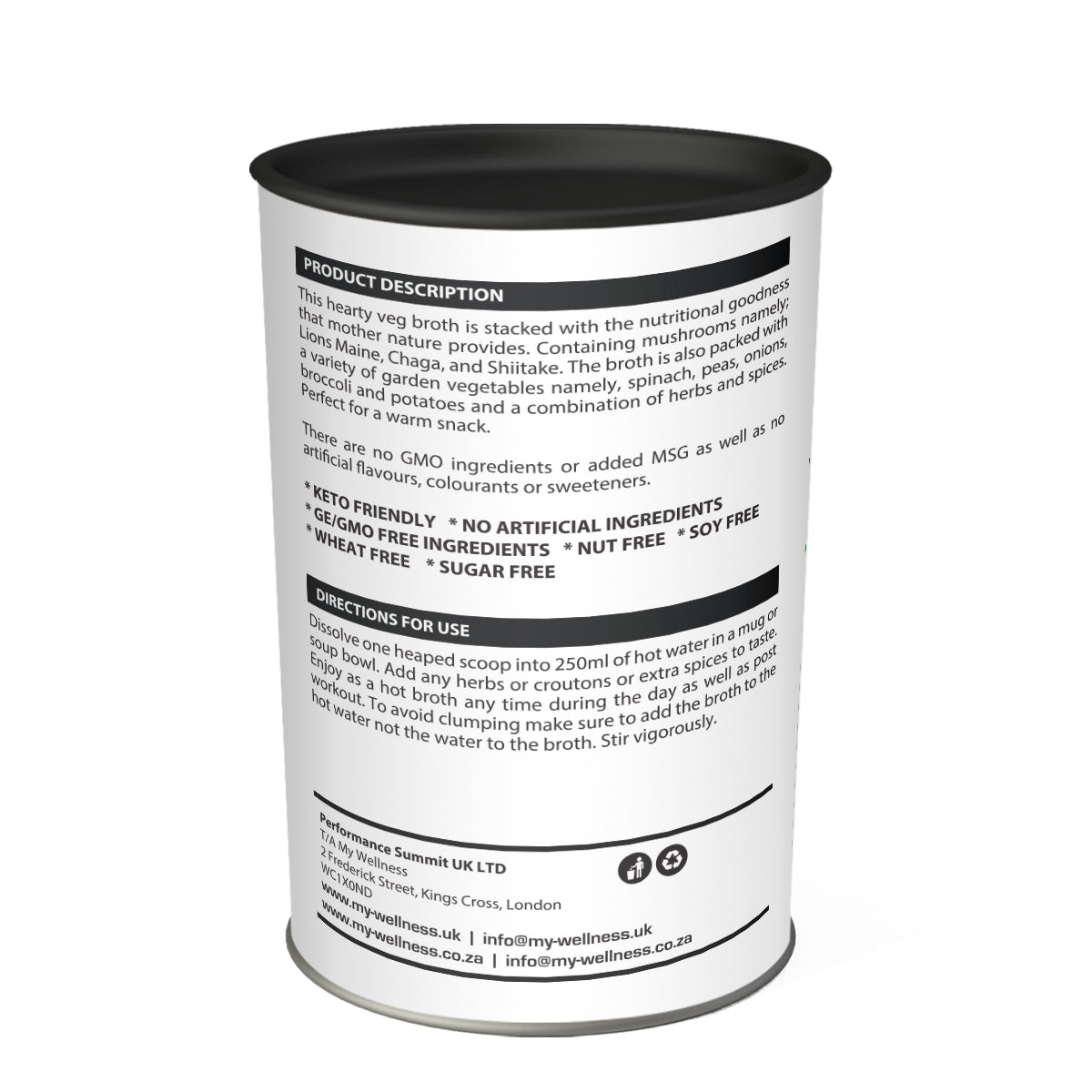 This hearty veg broth is stacked with nutritional goodness that mother nature provides. Containing mushrooms namely, Lions Mane Chaga, Shiitake. The broth is also packed with a variety of garden vegetables namely, spinach, peas, onion, broccoli and potatoes and a combination of herbs and spices. Perfect for a warm snack.