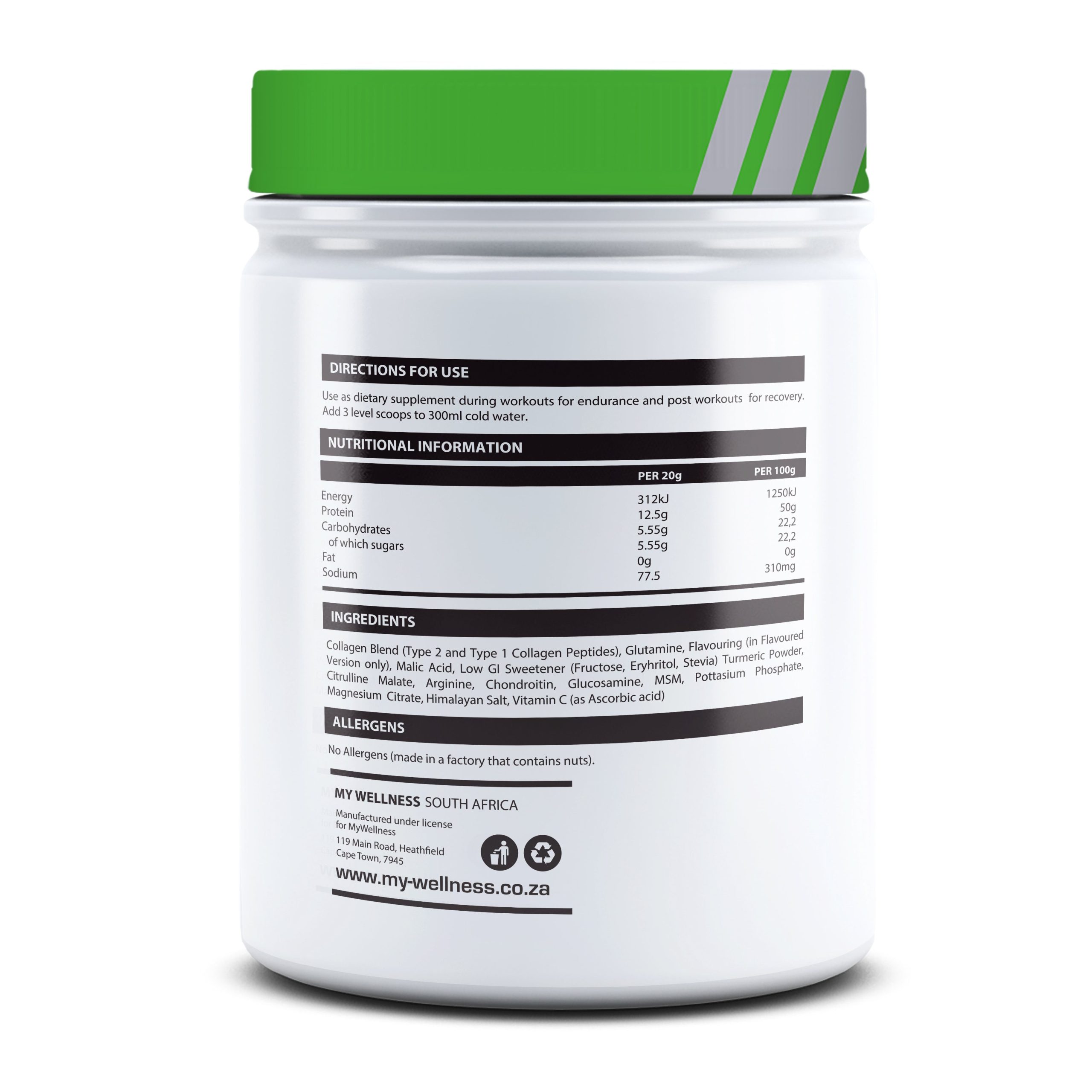 Collagen Blend (Type 2 and Type 1 Collagen Peptides, Glutamine, Flavouring, Malic Acid, Low GI Sweetener (Fructose, Erythritol, Stevia), Turmeric Powder, Citrulline Malate, Arginine, Chondroitin, Glucosamine, MSM, Potassium Phosphate, Magnesium Citrate, Himalayan Salt, Vitamin C (as Ascorbic Acid)