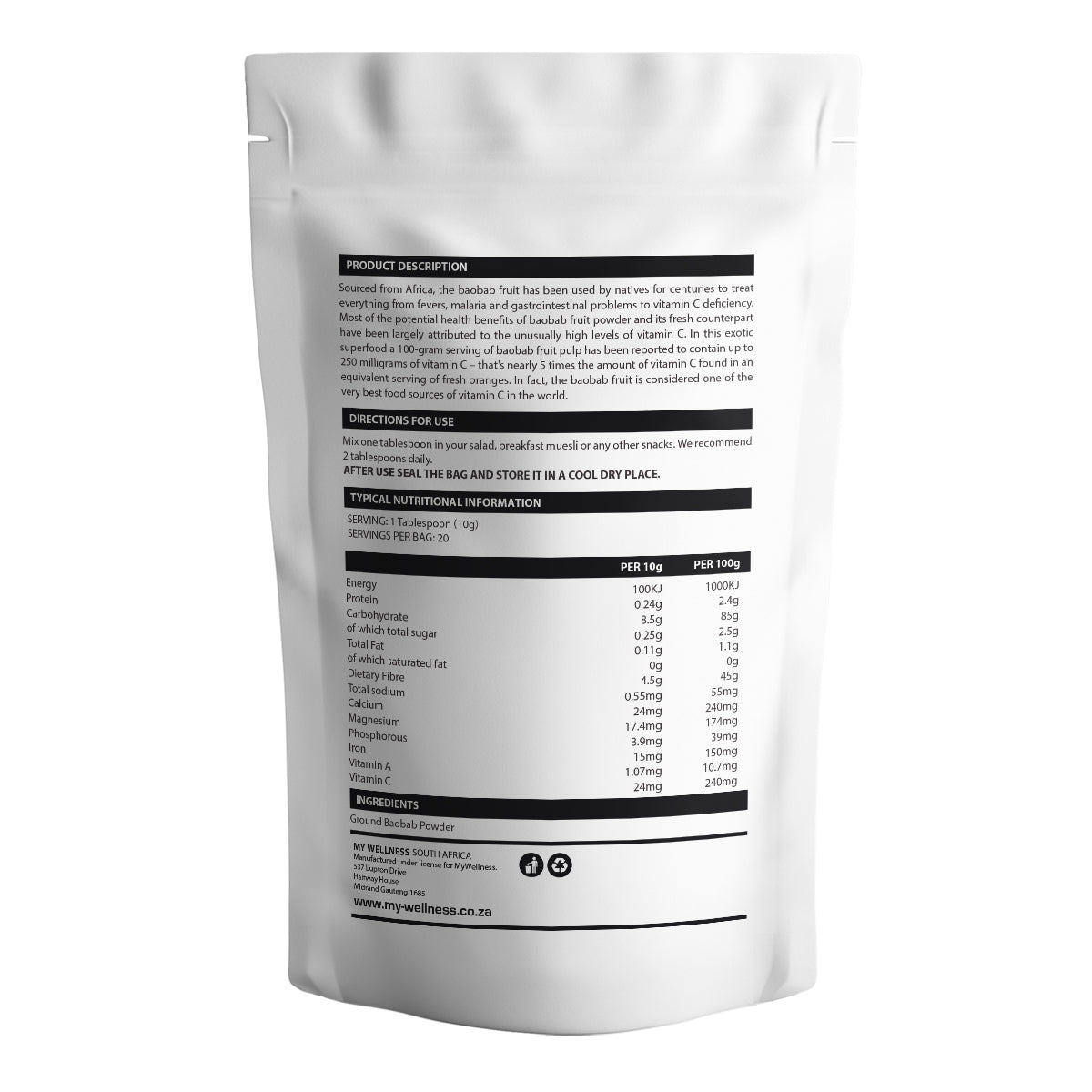 DIRECTIONS FOR USEMix one tablespoon in your salad, breakfast muesli or any other snacks. We recommend2 tablespoons daily.AFTER USE SEAL THE BAG AND STORE IT IN A COOL DRY PLACE.TYPICAL NUTRITIONAL INFORMATIONSERVING: 1 Tablespoon (10g)SERVINGS PER BAG: 20PER 10g                                        PER 100gEnergy 100KJ                              1000KJProtein 0.24g                               2.4gCarbohydrate 8.5g                      85gof which total sugar 0.25g         2.5gTotal Fat 0.11g                              1.1gof which saturated fat 0g           0gDietary Fibre 4.5g                      45gTotal sodium 0.55mg                55mgCalcium 24mg                           240mgMagnesium 17.4mg                   174mgPhosphorous 3.9mg                 39mgIron 15mg                                 150mgVitamin A 1.07mg                     10.7mVitamin C 24mg                       240mgINGREDIENTSGround Baobab Fruit Powder