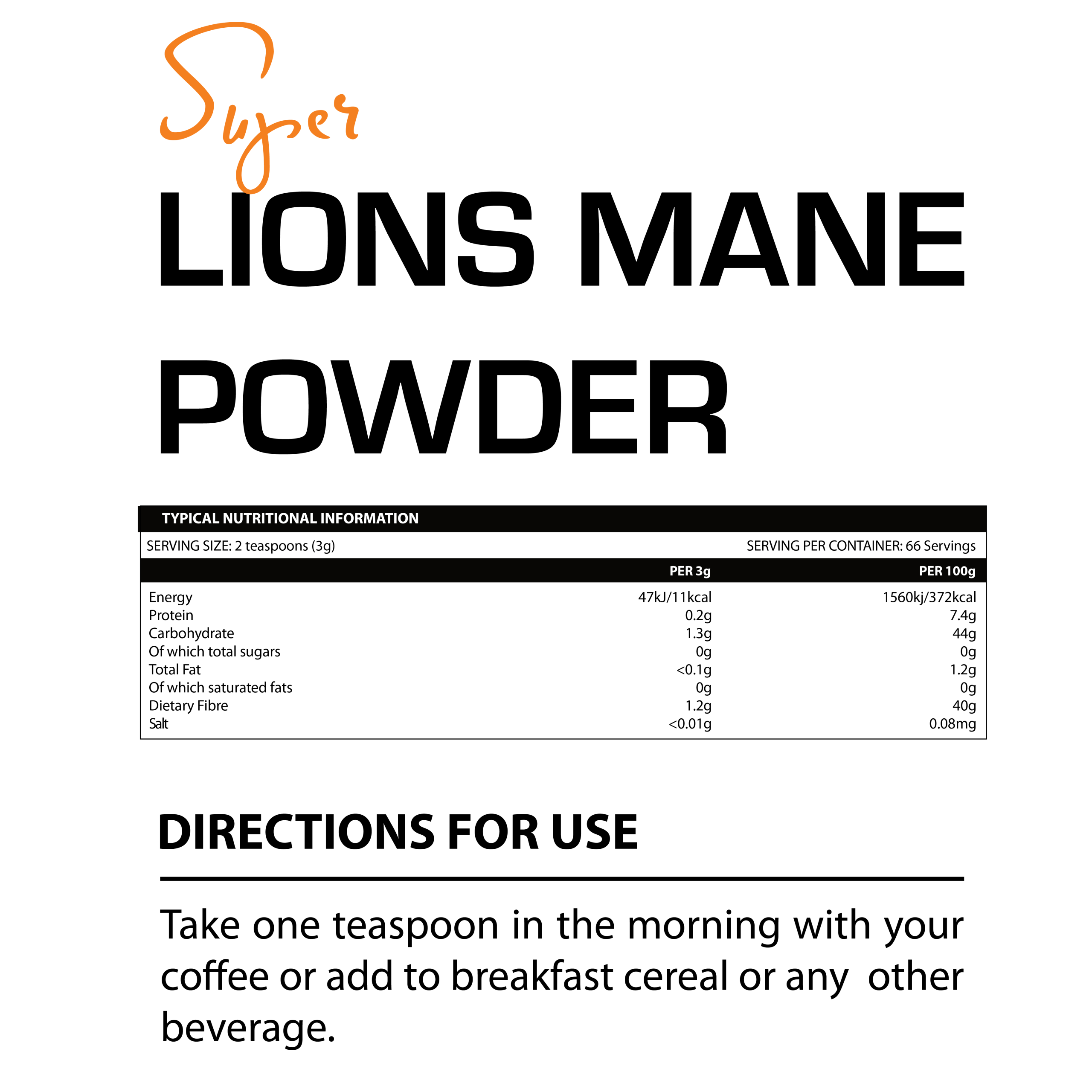 Take one teaspoon in the morning with your coffee or add to breakfast cereal or any other beverage.